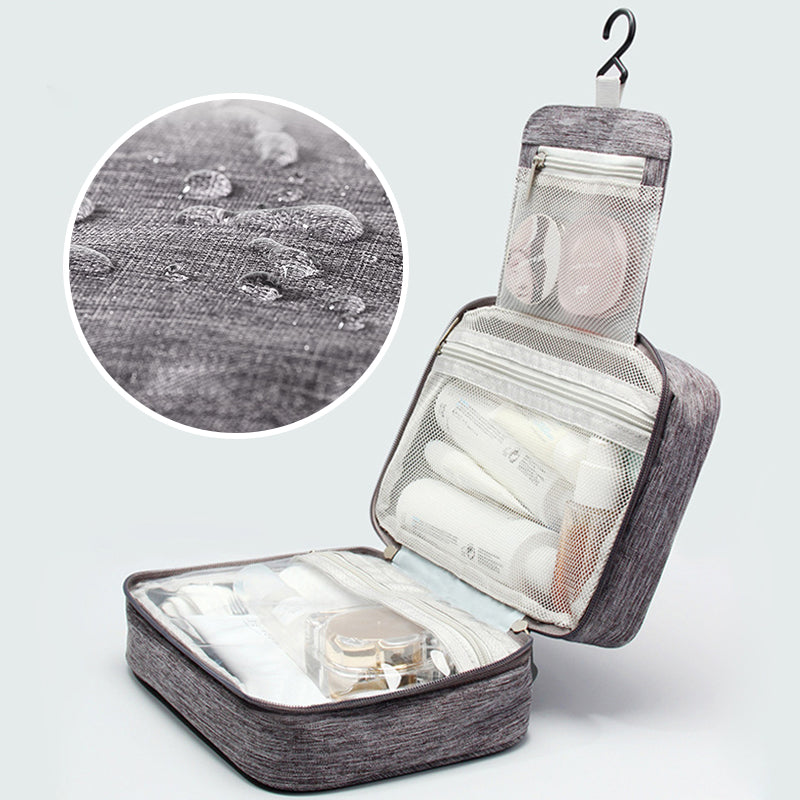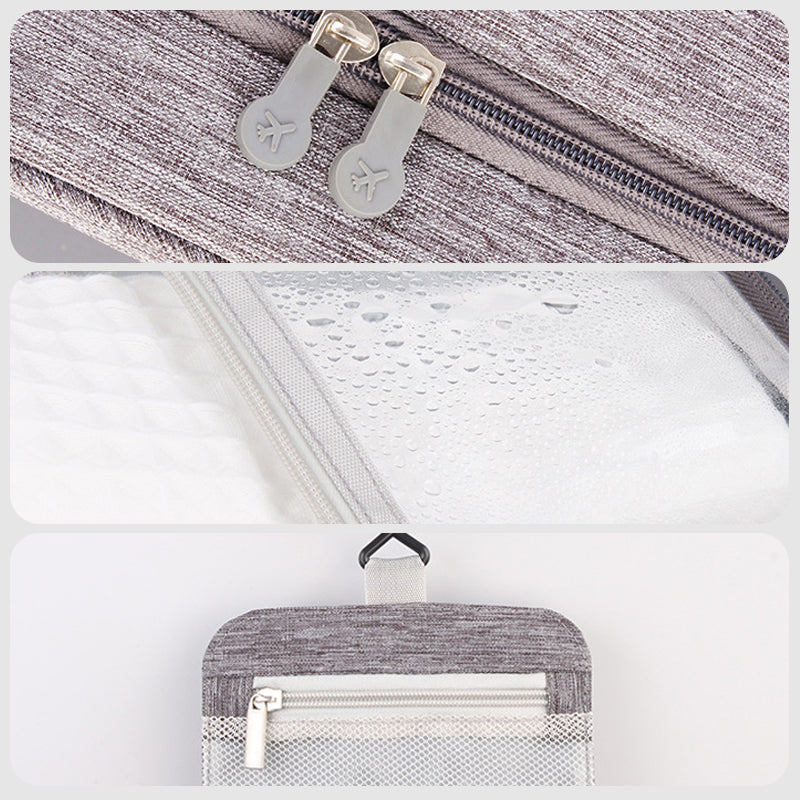 Meet your perfect travel companion, the Large Capacity Multifunctional Waterproof Folding Makeup Bag. Crafted from cationic waterproof fabric, it keeps your cosmetics and toiletries safe and dry. With a multifunctional design, hanging hooks, and three large compartments when unfolded, it's ideal for efficient storage and organization. Multiple compartments, including mesh and PVC zipper bags, ensure tidy classification. The widened and portable handle adds convenience to your travels. Say goodbye to clutter and hello to organized bliss!