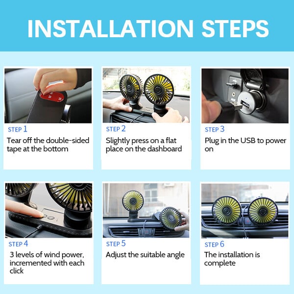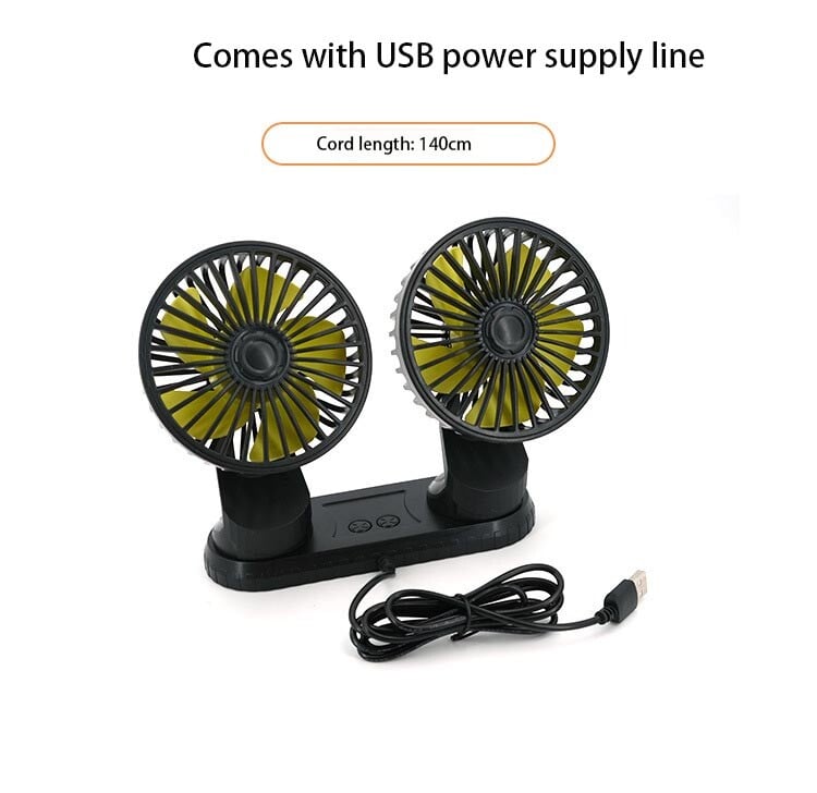 【DUAL HEAD & USB POWERED】: Designed with 2 fan heads, the car fan can cool down the driver and passengers at the same time, the 2 heads are independent to control wind speed and power on/off. The electric fan is powered by a USB cable(5V-2A, 4.9ft), which is compatible with a car charger, laptop, power bank, USB socket, etc.